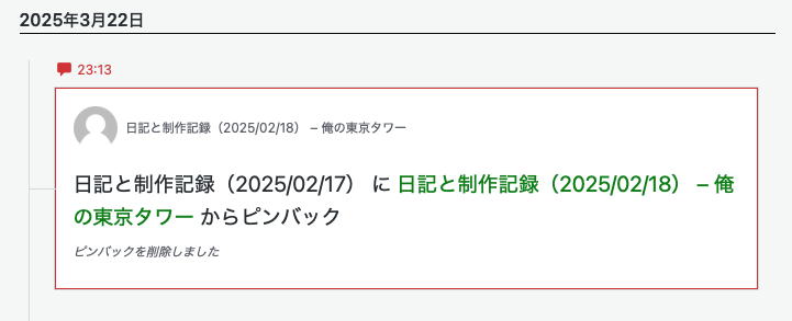 ・で、2025/02/18の記事内で、02/17の記事のリンクを貼った為に、ピンバックされた。ピンバックのコメントは不要だったのでゴミ箱に入れたんだけど、ゴミ箱に入れていたものが、30日経って自動的に削除されて、その通知が来たのがこれだったようだ。